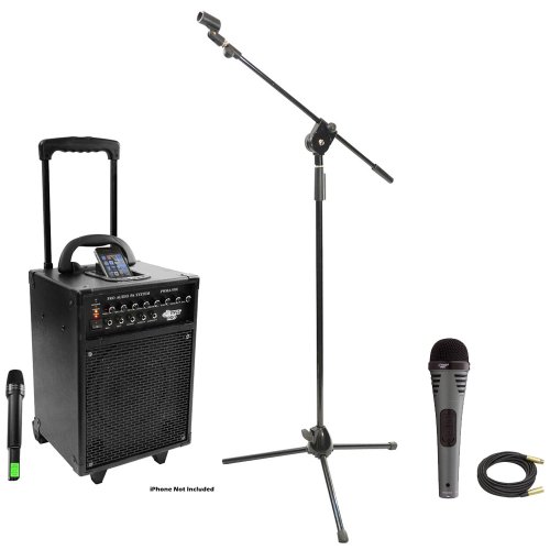 Pyle Speaker, Mic, Cable and Stand Package - PWMA930I 600 Watt VHF Wireless Portable PA Speaker System/Echo W/Ipod Dock - PDMIK2 Professional Moving Coil Dynamic Handheld Microphone - PMKS3 Tripod Microphone Stand W/ Extending Boom - PPMCL50 50ft. Symmetric Microphone Cable XLR Female to XLR Male Feature